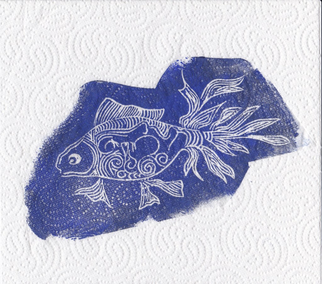 Deux poissons, c’est la période… Je les ai gravés dans le lino, avec de petits détails, toujours dans la finesse. Des personnages sont cachés dans leurs écailles. L’impression sur sopalin donne de la légèreté, j’aime ses effets de matière