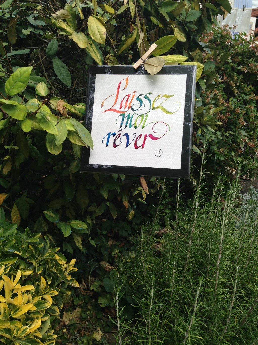 Riches rencontres, plaisir d’investir un très mignon petit jardin, calligraphie de prénoms pour le plaisir des sourires en retour, informations sur les portes ouvertes de mon atelier (la semaine du 15/09 of course)