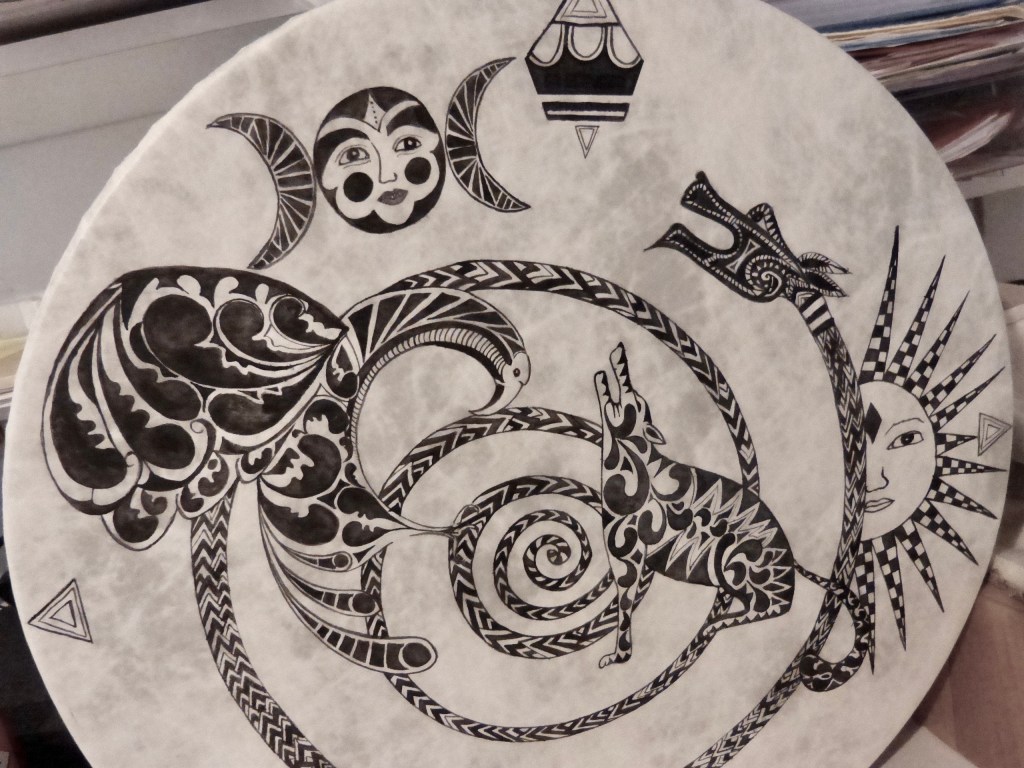 La décoration d’un tambour est un exercice complexe. Outre le format et le support, il faut réfléchir aux thèmes qui nous touchent le plus et apporteront de la force à notre instrument. Une fois ces thèmes choisis, leur représentation doit être le plus proche possible de notre univers poétique.