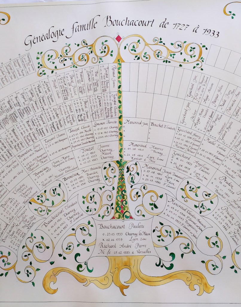 J’en ai donc profité pour finaliser ce grand puzzle, cet incroyable généalogie sur 9 générations… Il m’a fallu chercher longtemps, pour trouver à faire tenir cette longue période, de 1727 à 1933… L’angoisse de buter sur un nom ou de me tromper de date… Naissance, mariage, décès, chaque vie tient en 4 lignes, mais ces lignes s’assemblent et s’intercroisent, prenant vie dans l’arbre. J’ai créé cette composition entrelacée sur mesure pour ma cliente, harmonisant dans un minimum d’espace cette longue liste.