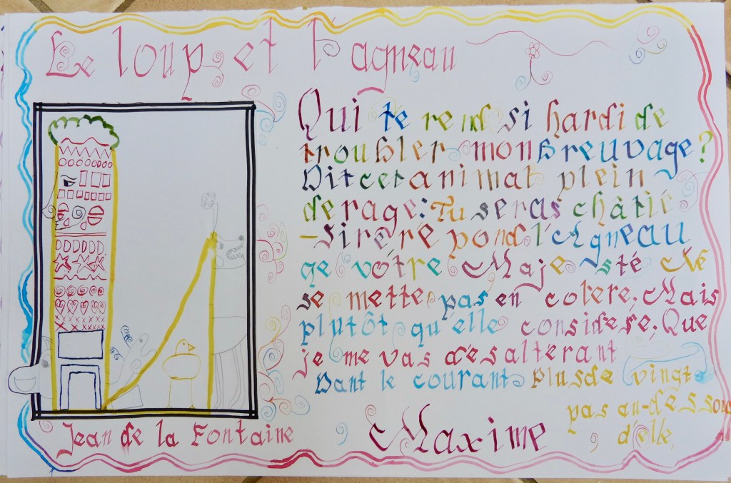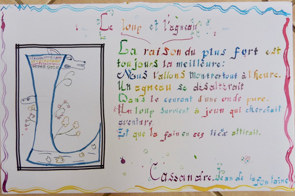 Après avoir créé leur lettrine, en se démarquant par leur imagination prolifique, les apprentis calligraphes ont tracé, avec lenteur et application, quelques vers de la fable choisie, ne manquant pas de décorer les quelques tâches d’encre mal placées..