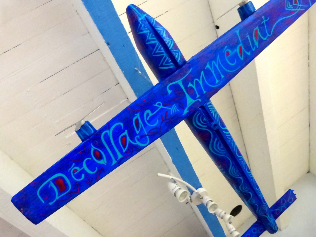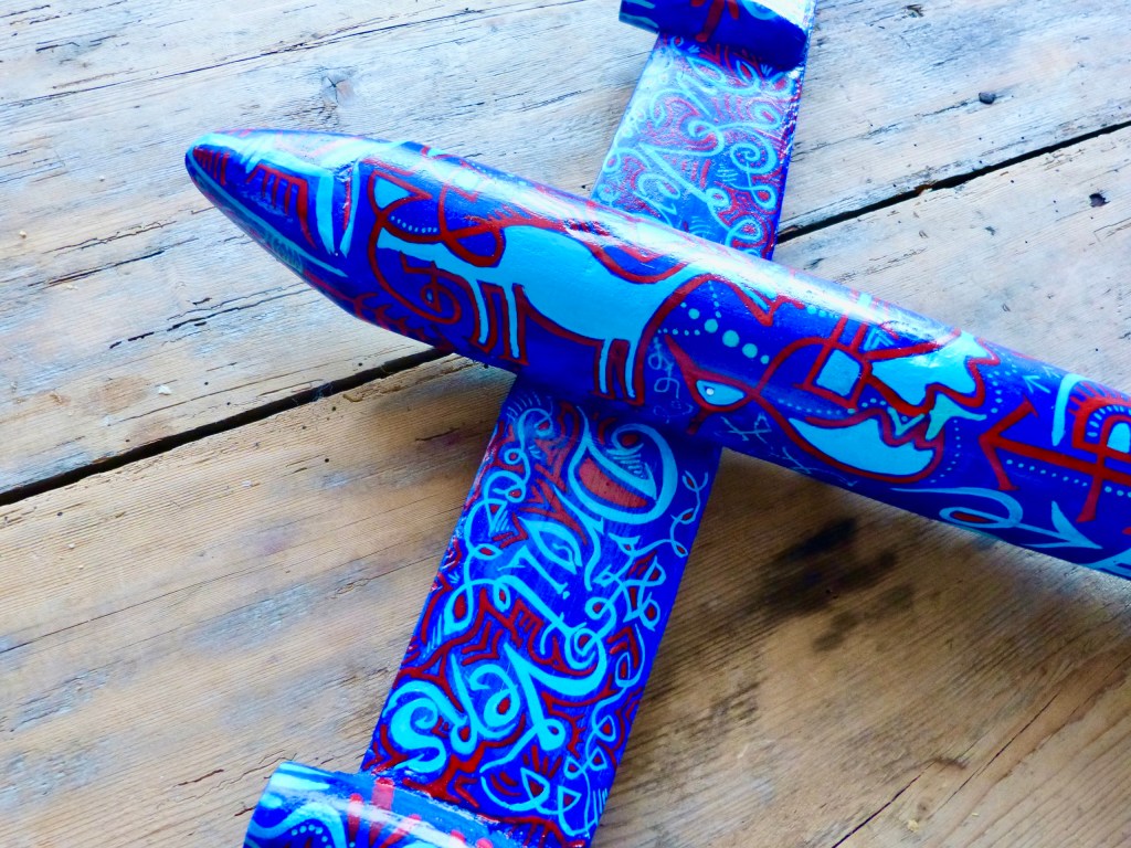Reprise symbolique, j’ai tracé mes couleurs sur un vieil avion de bois, souvenir précieux que mon mari conserve de sa petite enfance. Un vieil avion qu’à l’époque il regardait de loin, accroché au plafond, avec interdiction de le toucher. Bien sûr, cela suscite la curiosité et la féroce envie de l’attraper! C’est chose faite aujourd’hui, alors pour lui rendre une deuxième jeunesse je l’ai décoré de couleurs vives et de mots de liberté. Nous l’accrocherons à notre plafond, nous verrons ce que la suite de l’histoire en fera, et si des yeux d’enfant sauront rêver de l’attraper…