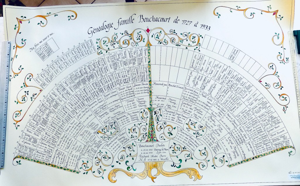 Je me suis pris d’amour pour la réalisation de ces arbres généalogiques, tous ces noms rassemblés, ces histoires résumées en dates et en places dans un schéma, cela me fascine. En calligraphiant ces petites étiquettes je m’imagine des vies, des rencontres, des déplacements, ou des terres immuables. Je prends le temps de composer, de comprendre, d’orner, pour ensuite tracer chaque lettre sans oubli, sans faillir, une lettre changée peut changer aussi un souvenir. Que de sueurs froides!