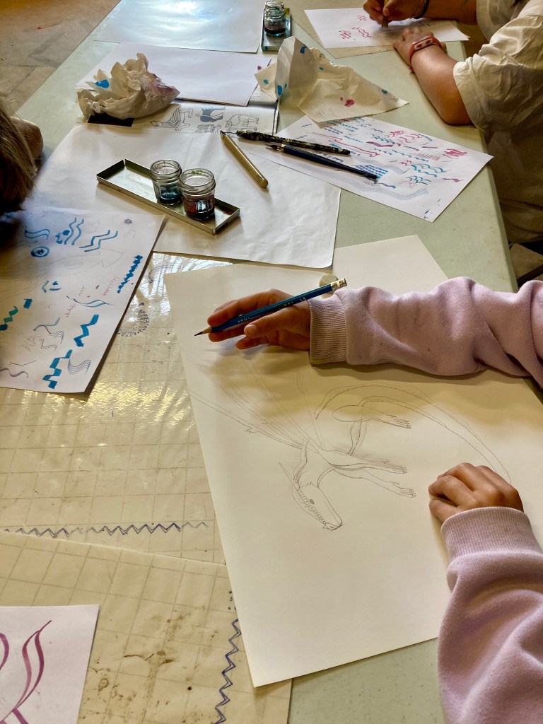 Après la mise en place sur grand format, ils ont travaillé le graphisme avec les plumes métalliques et l’encre. Puis ont appris à calligraphier le nom inventé pour le tracer sur le format final. Les défis étaient grands, en seulement 4 jours il a fallu imaginer et dessiner un animal inventé et personnel, chercher à améliorer les détails, apprendre à utiliser les plumes, l’encre, découvrir et savoir utiliser la calligraphie latine… de plus dans un lieu inconnu en collaborant avec des camarades à apprivoiser aussi. Le défi a été accepté dans le doute, il est tellement difficile pour eux de se faire confiance, et me faire confiance, moi qu’ils ne connaissent pas encore. Mais ils sont optimistes malgré tout, et ils y sont tous arrivés. Je suis très fière de leur investissement et de leur grande réussite. Les entendre se féliciter de leurs progrès en écriture ou en graphisme, les surprendre observer l’autre et sa façon de faire, le complimenter. Ce sont des moments précieux, quand l’enfant apprend et grandit dans le geste et la concentration.