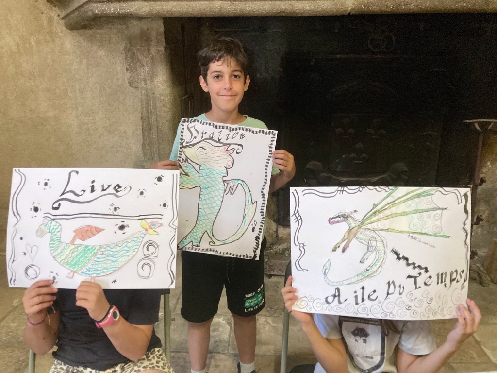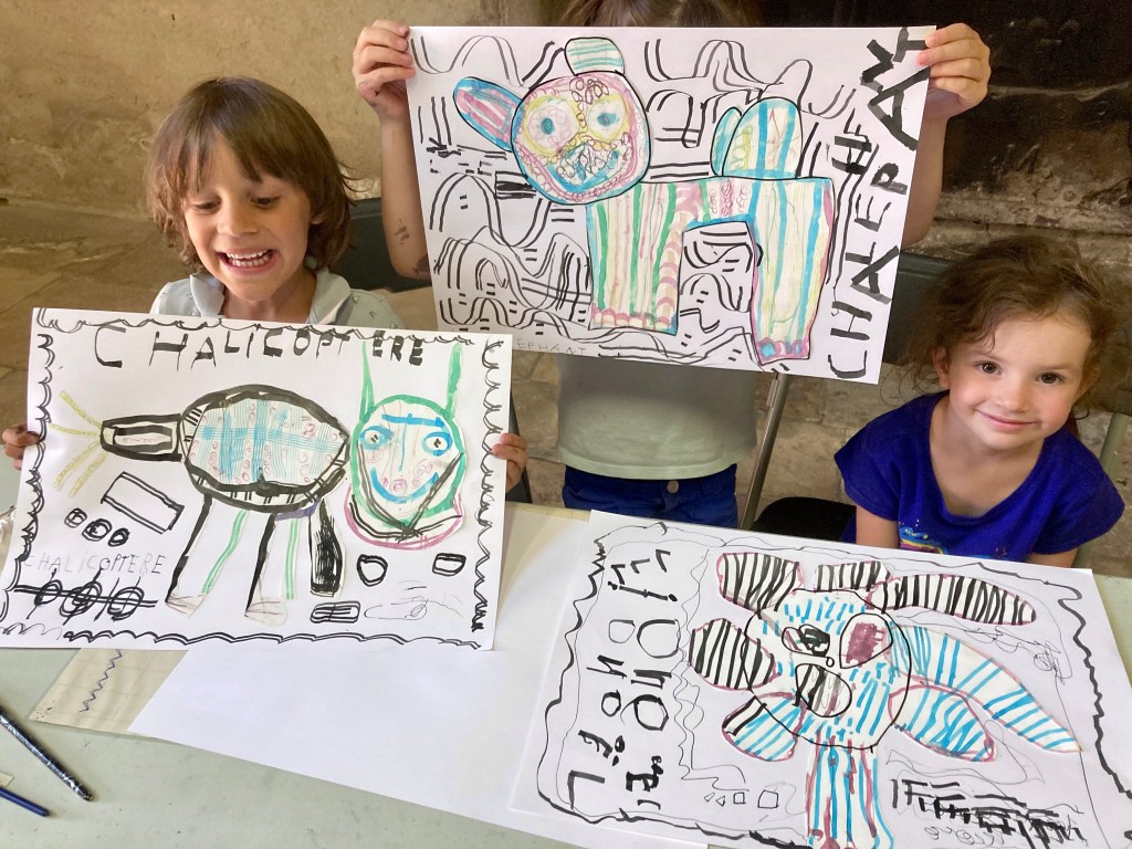 Cette semaine, du 15 au 18 juillet, 2 groupes d’enfants de 5 à 10 ans ont travaillé autour du thème des animaux fabuleux. En 4 séances, ils ont imaginé leur animal imaginaire, hybride et magique. Je leur ai demandé de choisir un prénom, ils n’ont alors pas manqué de me faire sourire: Le Chacureuil, le Chalicoptère, le Dralion, le Loup Poulpe, l’Aile du temps…. on oscille entre humour et poésie à chaque instant avec ces jeunes artistes…