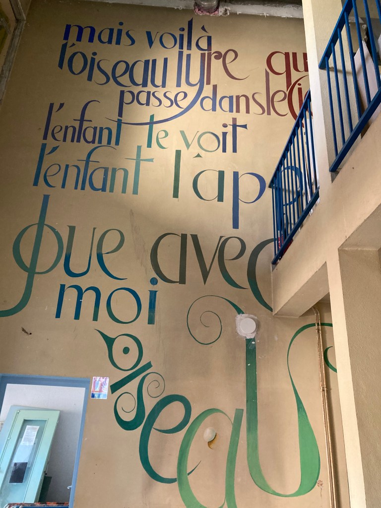 J’ai la chance d’avoir été contactée par l’association des amis de Michel Bouillot, pour restaurer une fresque réalisée par cet artiste dans les années 70, sur le grand mur de l’école Marie Curie à Cluny. Mr Bouilot était un passionné, peintre, sculpteur et historien. Professeur de dessin et membre de l’académie de Mâcon. Son oeuvre est abondante, et la calligraphie fort présente.