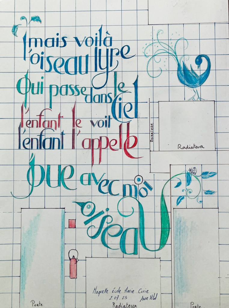 J’ai choisi de garder certaines compositions importantes, et de changer des rythmes. J’ai ajouté un oiseau et des plumes, car nous sommes dans une école primaire, il me semblait important de mettre une note de poésie là où je le pouvais.