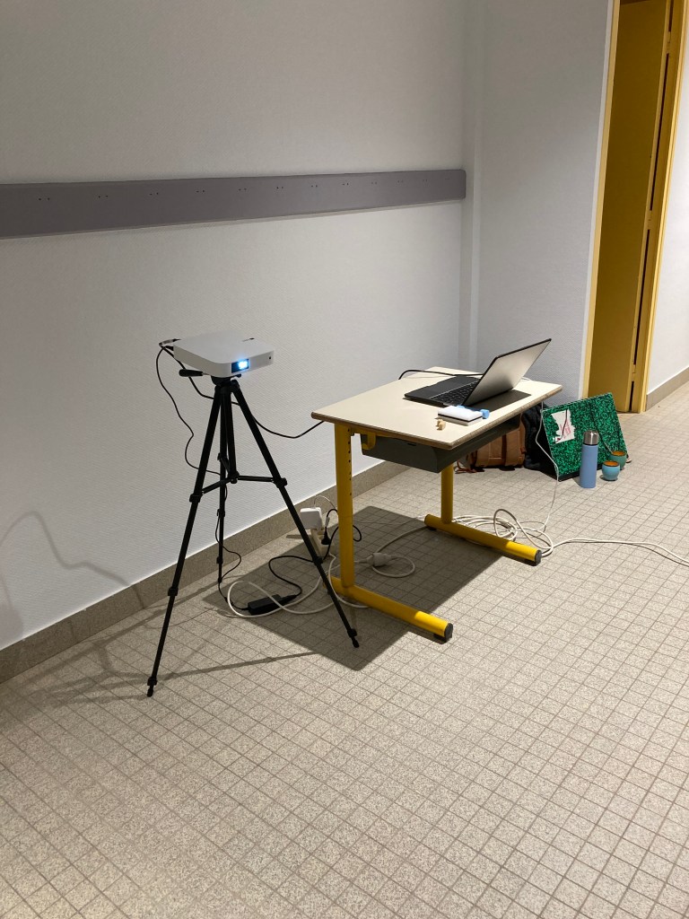 La mise en place m’a pris la journée: trouver les réglages pour projeter la composition, trouver la bonne taille, arriver à éteindre les lumières du hall, un grand moment de technologie pour moi!! J’ai ensuite tracé à la craie chaque lettre, juste pour la disposition. Je savais que je n’aurai pas la précision du tracé premier, et qu’ensuite je devrai vérifier les verticales, les hauteurs de lettres, les horizontales sur un mur ancien… Le traçage au pinceau sera complexe.
