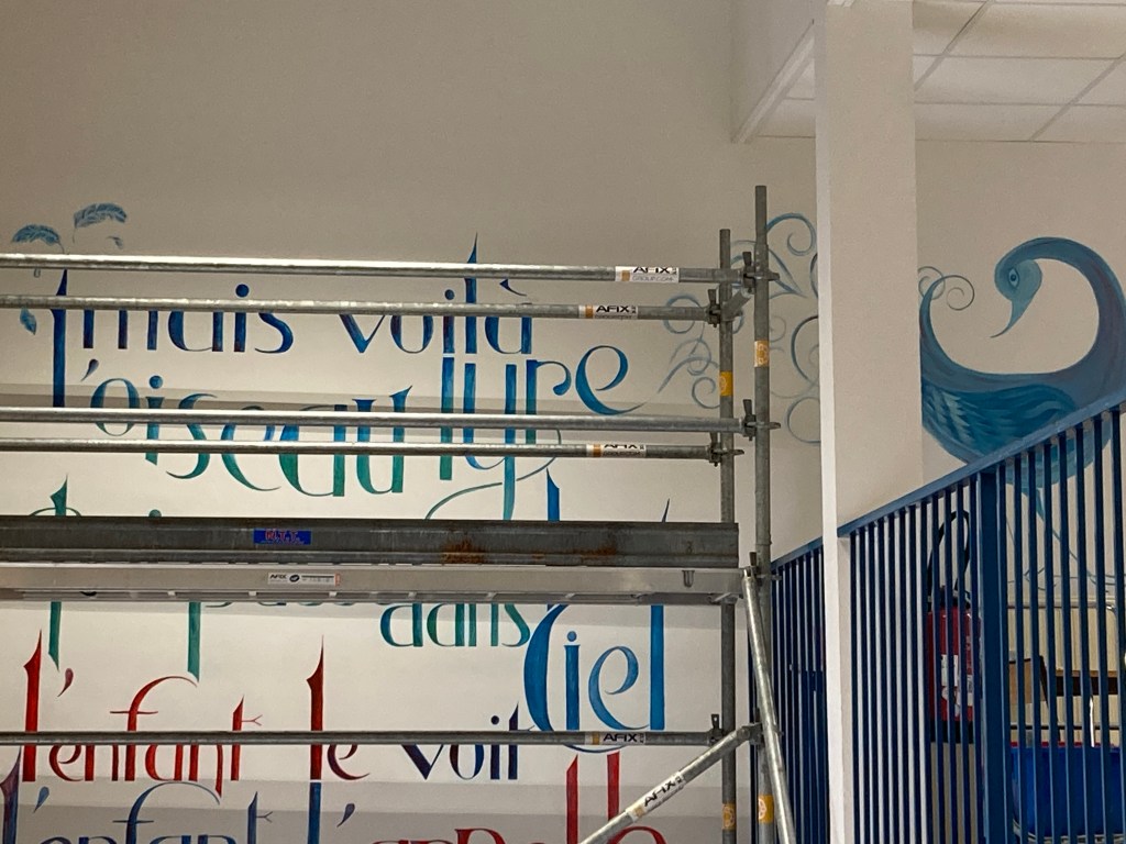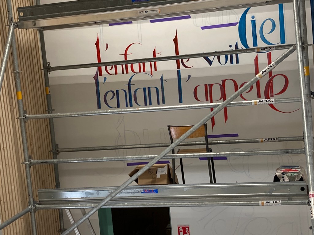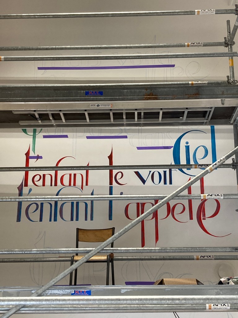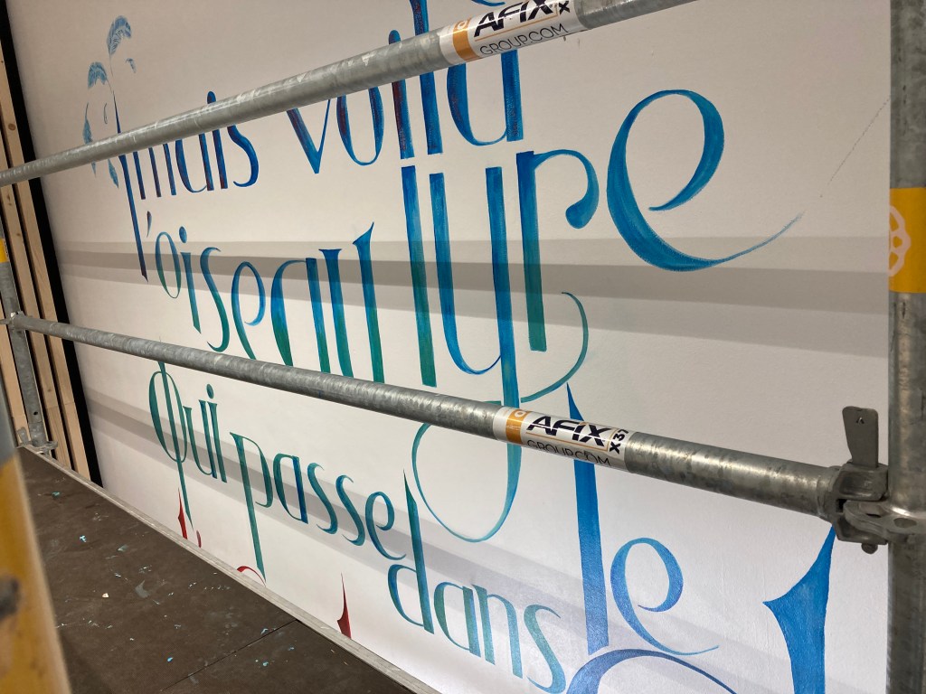 Nous sommes vendredi et je suis rassurée, tout se passe bien, la composition se révèle, j’ai presque fini tout le haut. J’ai gagné en assurance en hauteur, j’arrive maintenant à travailler debout tout en haut de l’échafaudage, je n’y aurais pas cru lundi… J’ai pris mes repères, mais le problème reste l’échafaudage en lui même qui masque des endroits, et me place à des niveaux parfois compliqués. Par exemple au milieu je suis trop basse pour certaines lettres, j’ai dû monter sur une chaise et peindre en équilibre instable. C’est compliqué de tracer droit.. et de bien visualiser le résultat. J’espère que je n’aurai pas de mauvaises surprises quand cet attirail aura été enlevé!