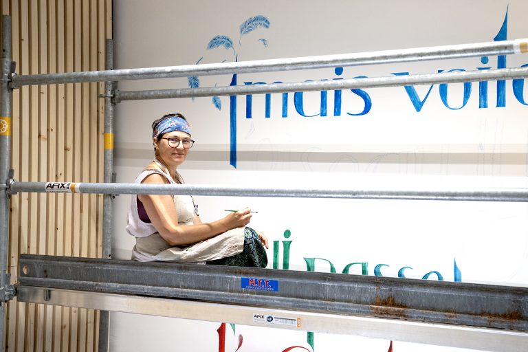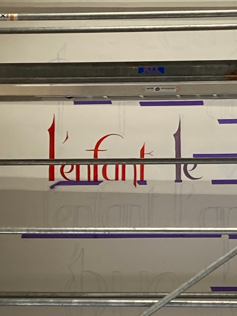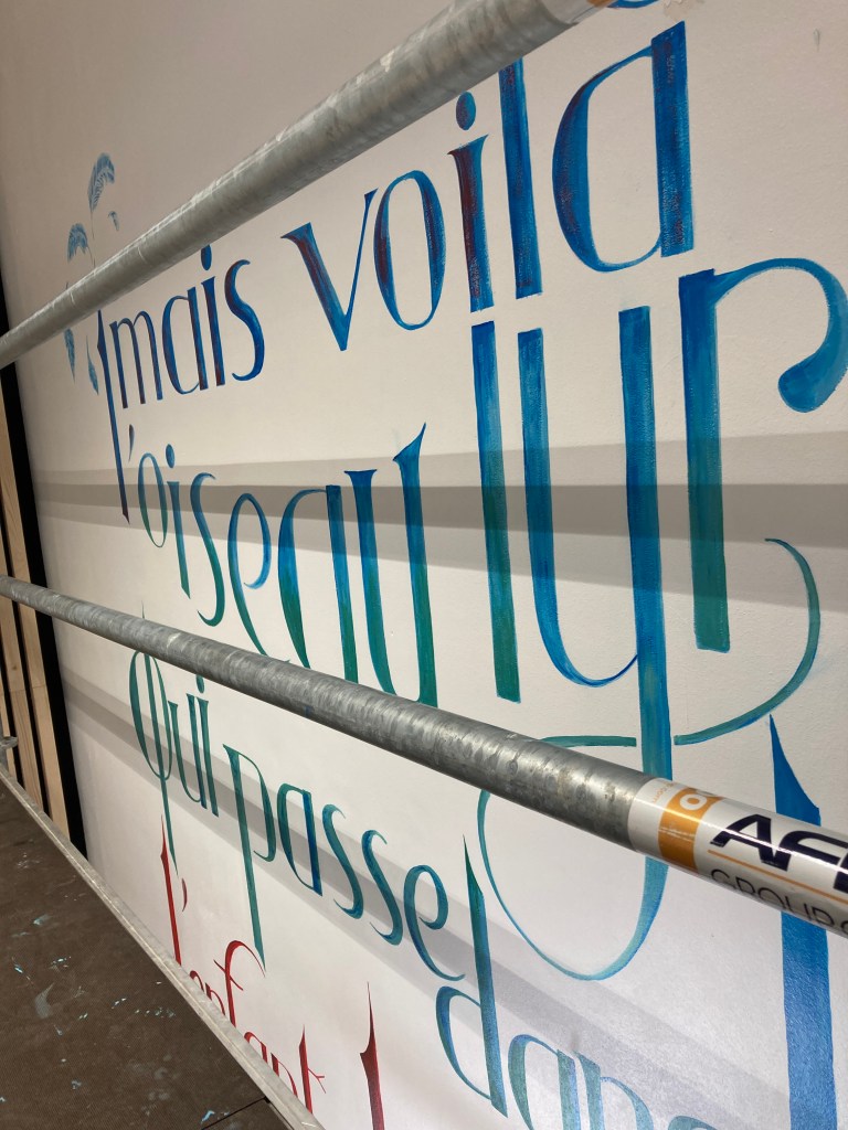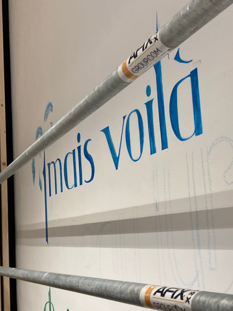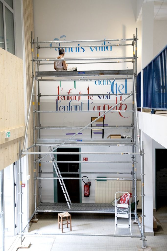 Nous sommes vendredi et je suis rassurée, tout se passe bien, la composition se révèle, j’ai presque fini tout le haut. J’ai gagné en assurance en hauteur, j’arrive maintenant à travailler debout tout en haut de l’échafaudage, je n’y aurais pas cru lundi… J’ai pris mes repères, mais le problème reste l’échafaudage en lui même qui masque des endroits, et me place à des niveaux parfois compliqués. Par exemple au milieu je suis trop basse pour certaines lettres, j’ai dû monter sur une chaise et peindre en équilibre instable. C’est compliqué de tracer droit.. et de bien visualiser le résultat. J’espère que je n’aurai pas de mauvaises surprises quand cet attirail aura été enlevé!