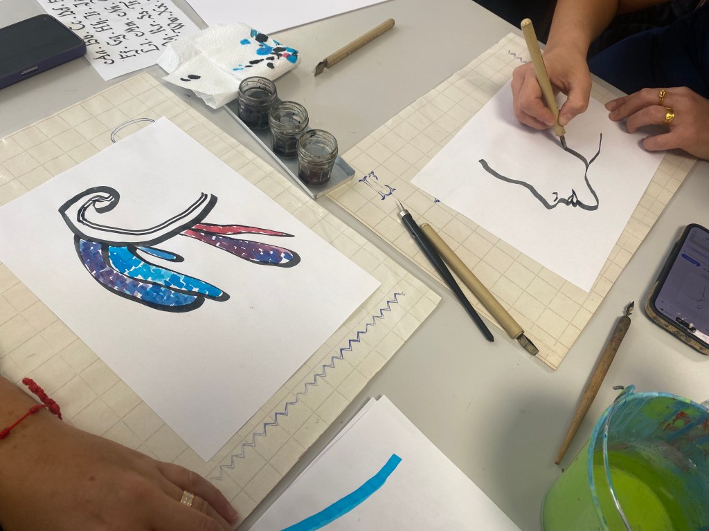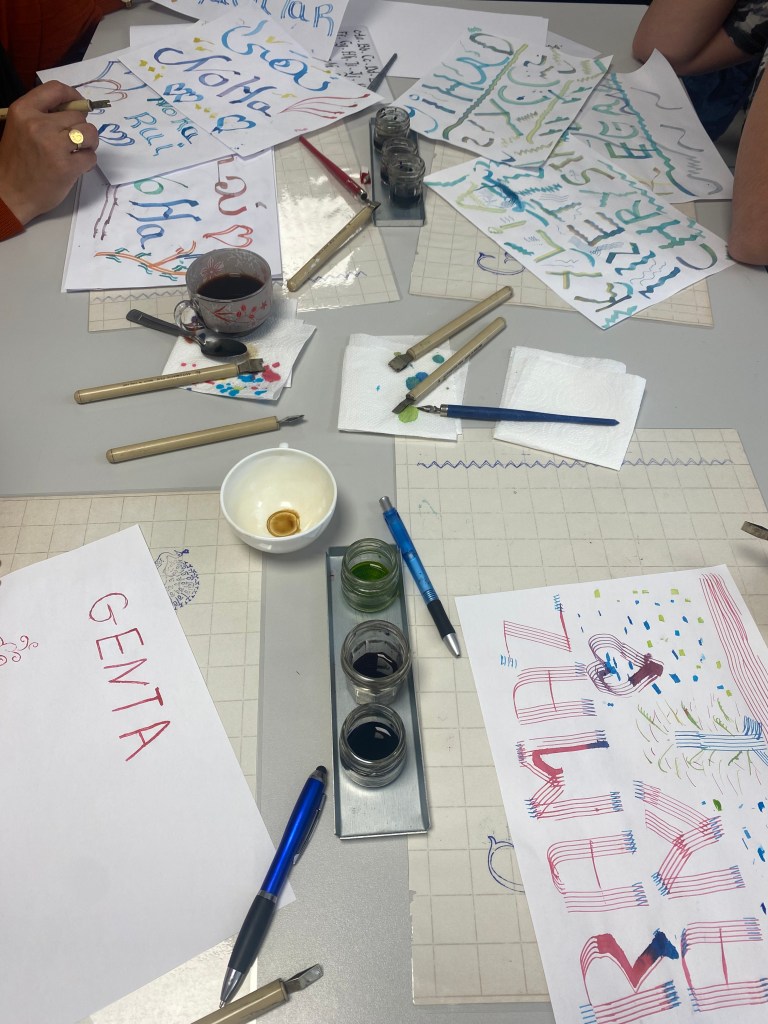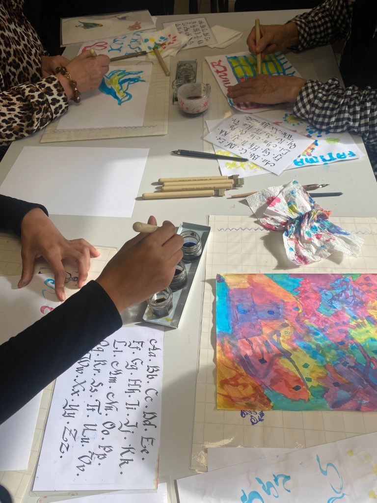 Avec deux groupes dans la journée, nous avons étudié les bases de cet art, chacun a pu essayer plusieurs types de plumes et tracer des prénoms, entre autres. En peu de temps les participants ont pu échanger entre eux, et traverser les frontières d’un art un peu effrayant pour ceux à qui il manque les codes de l’écrit.