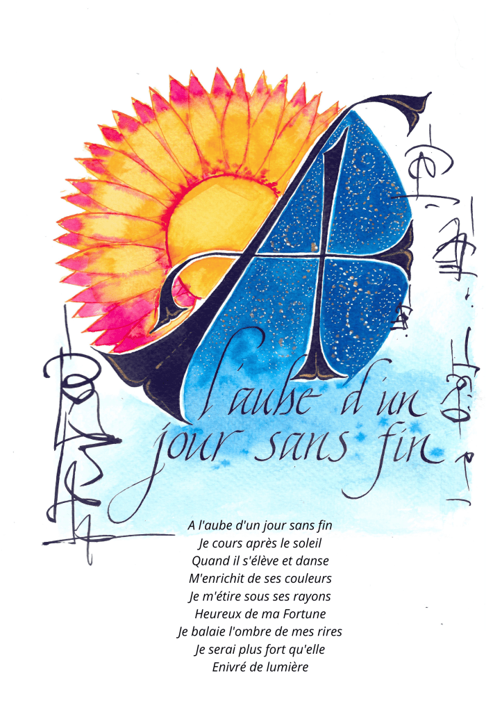 Il est aussi un recueil de poésie, car il en est parsemé. Les poèmes sont venus au cours de mon écriture, s’imposant dans le rythme du récit, amenant une lecture plus sensible et artistique des textes. Alors bien sûr, en tant que calligraphe, je ne pouvais laisser passer cette occasion d’illustrer ces vers. En voici un exemple: