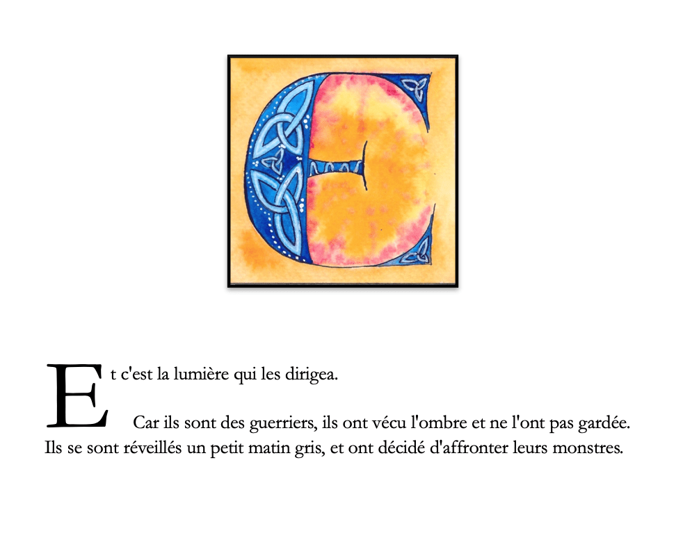 J’aime tant écrire et donner forme aux lettres, que je me suis amusée à créer des lettrines pour certaines de mes pages. Elles enluminent le texte et amènent le lecteur dans mon univers onirique, en enrichissant le sens de la narration: