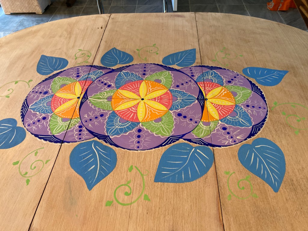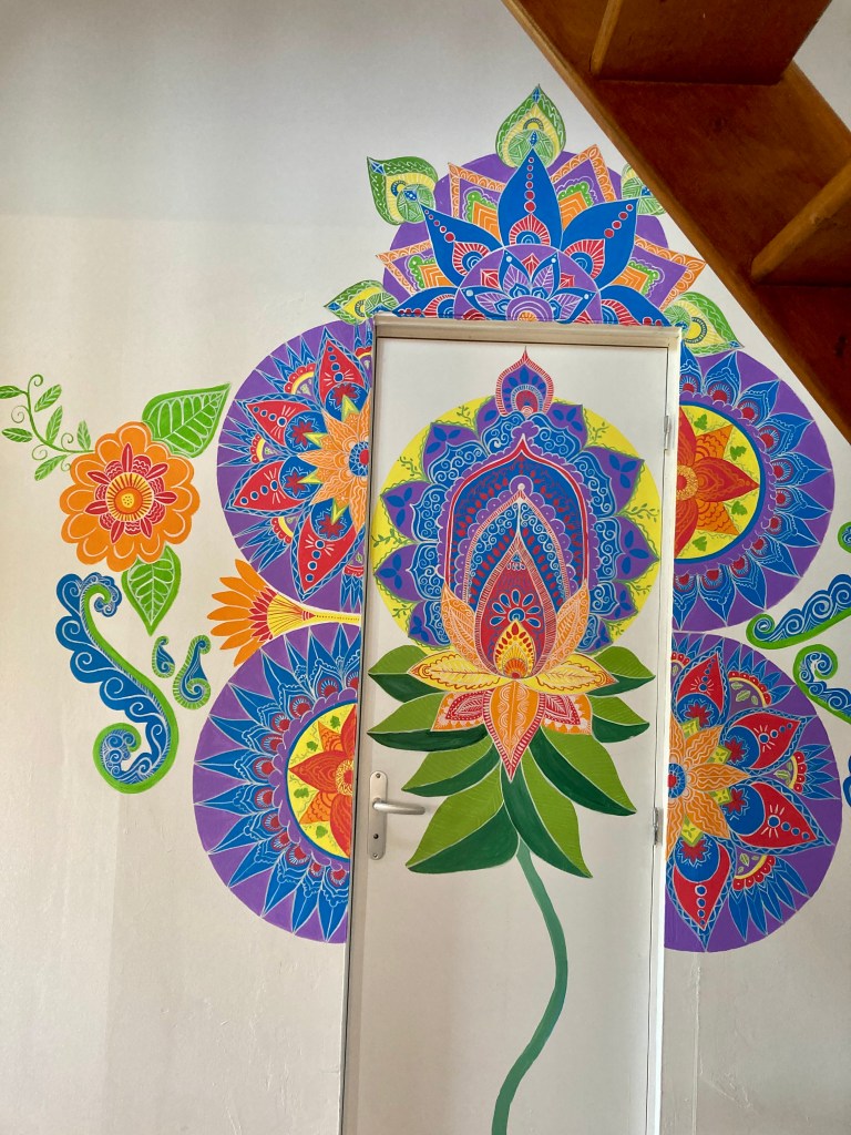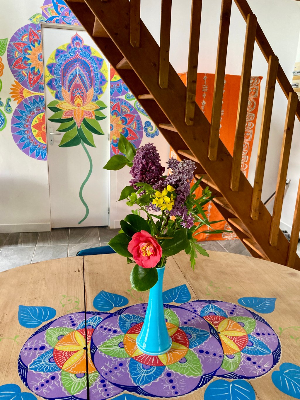 La restauration de cet endroit nous a donné tant de plaisir! Nous avons choisi de lui donner une image qui nous corresponde, artistique, atypique, tout en confort et en finesse. Les grands murs blancs m’ont donné envie d’une décoration en mandala, comme j’aime à faire, sans plan précis, suivant l’inspiration de l’instant. Entièrement peint à la main, ce mandala nous a donné ensuite toute l’identité du site… et son nom: le Mandadodo!!!